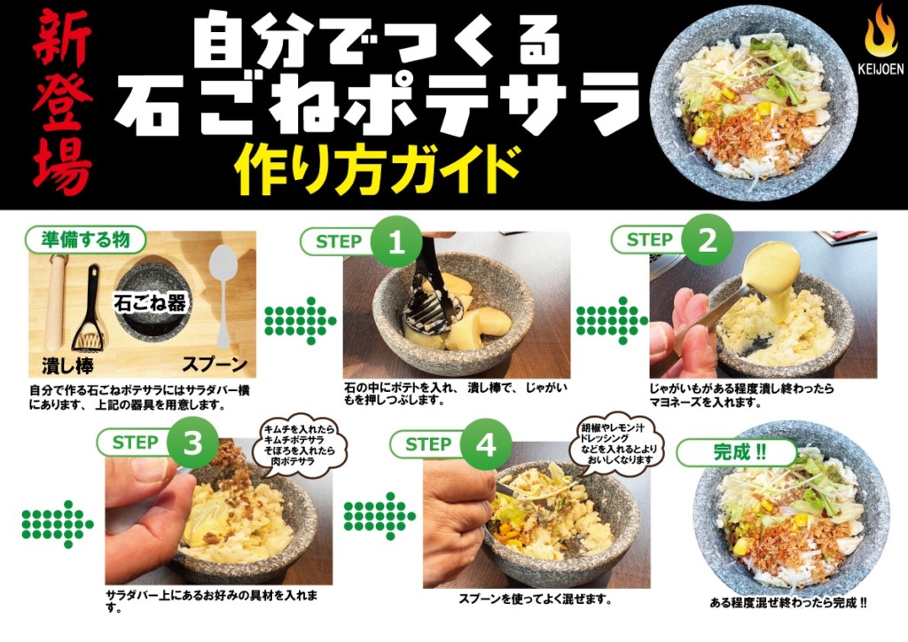 石の器の中で、じゃがいもを潰し、サラダバーの中にあるそぼろだとか野菜・キムチなどの自分の好きな野菜を入れる事で、世界に一つだけのオリジナルポテトサラダを作る事が出来ます。